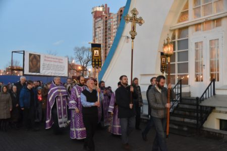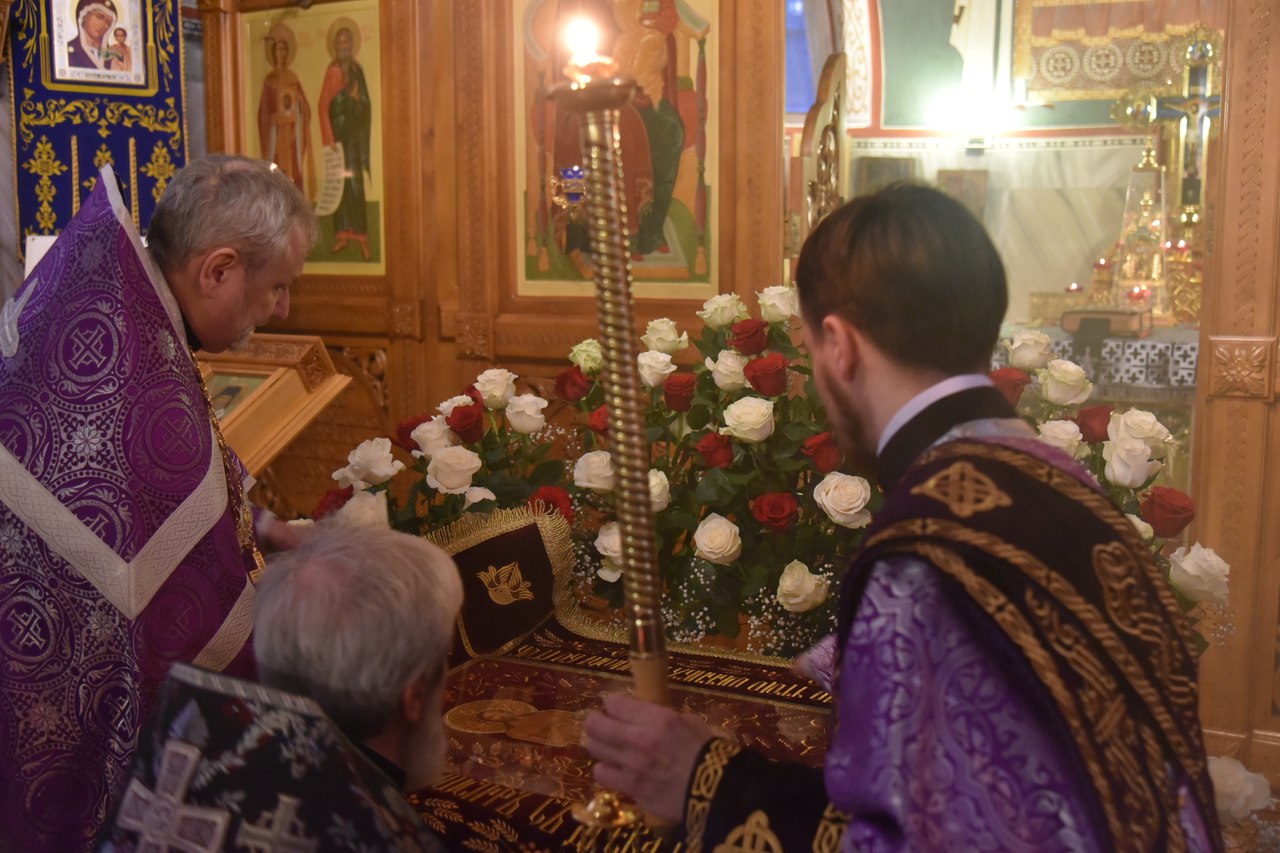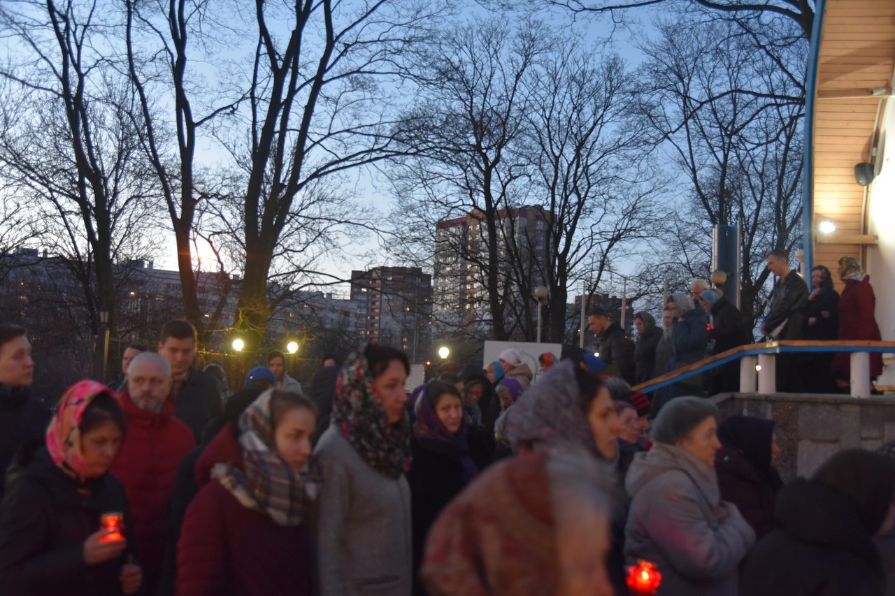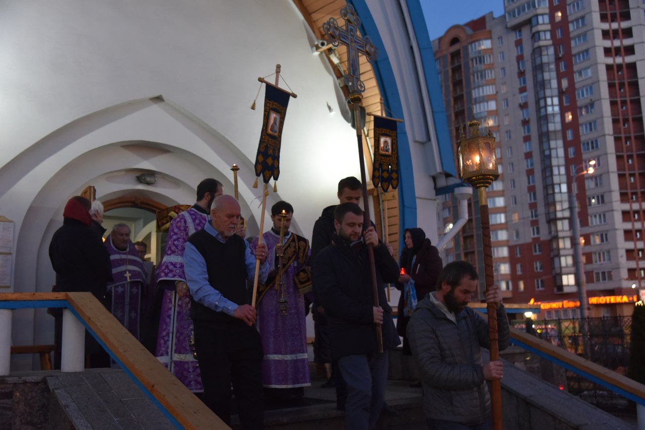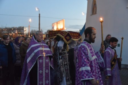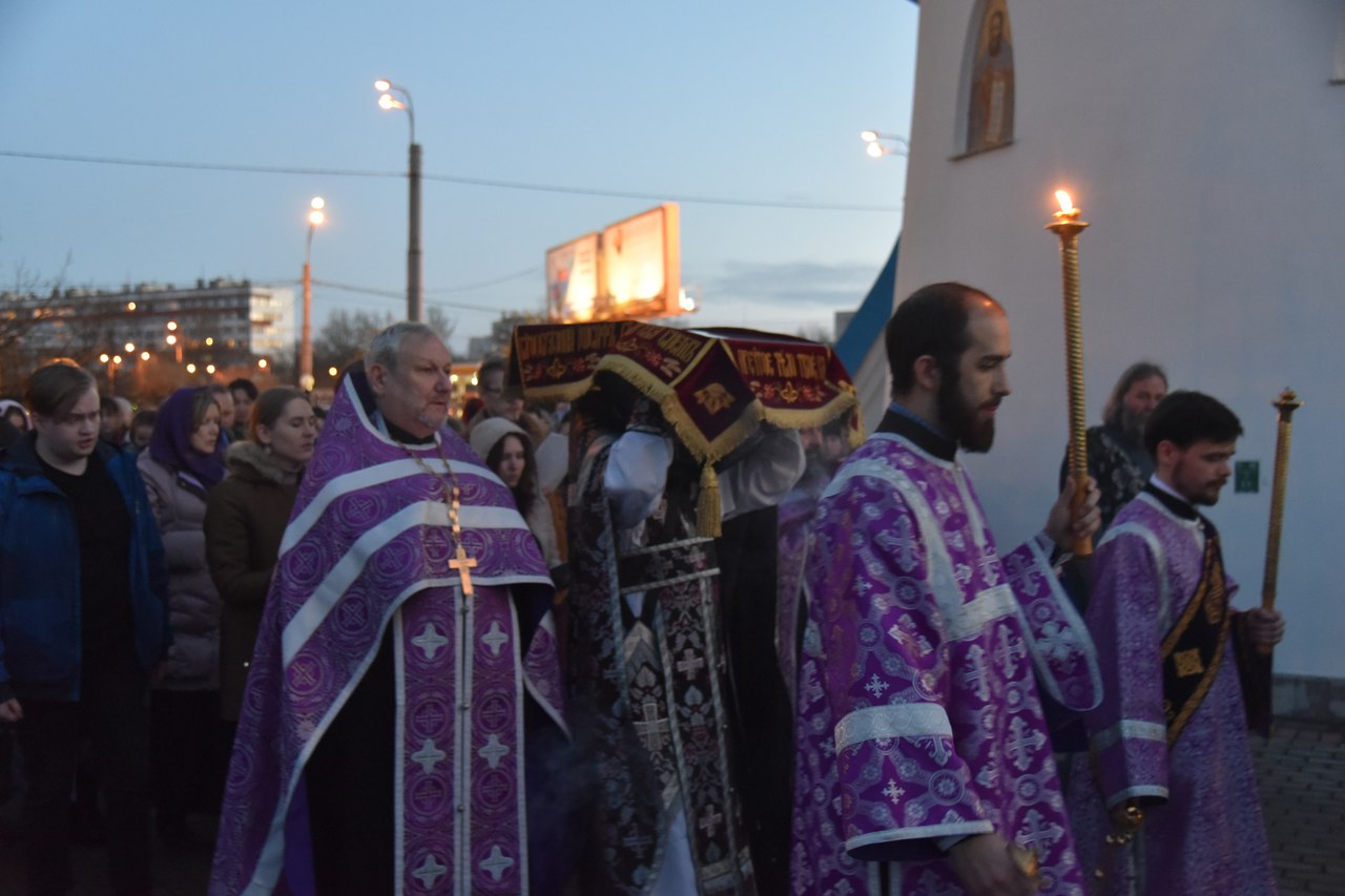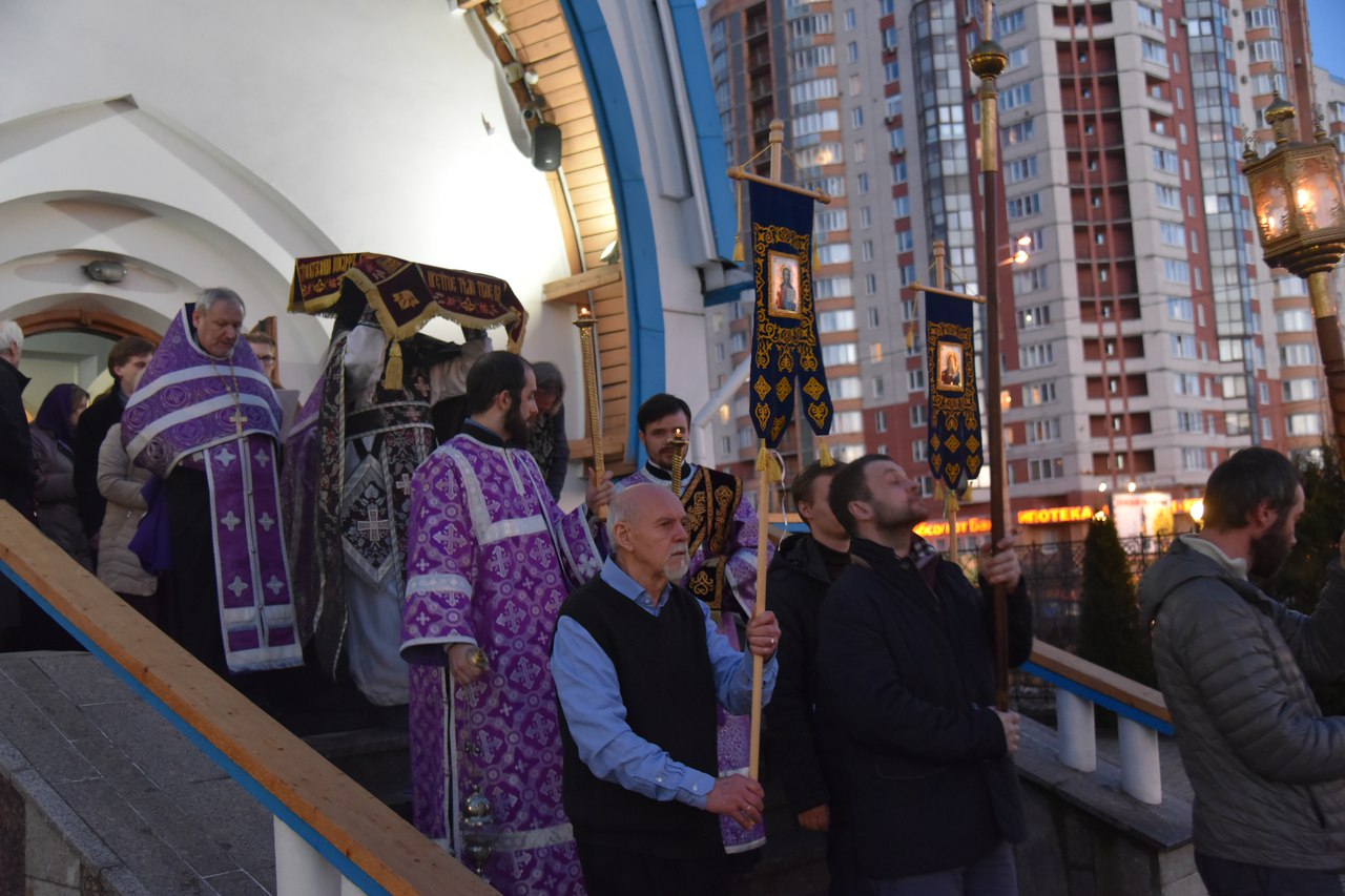 06 апреля в 18.00 в нашем храме была совершена утреня Великой Субботы с полиелеем в честь праздника Пресвятой Богородицы. После великого славословия при пении «Святый Боже» священнослужители и прихожане храма совершили крестный ход со Святой Плащаницей вокруг храма.