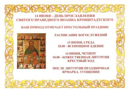 11 Июн 2018 Главная » Приходская жизнь » 14 июня — Престольный праздник в храме святого праведного Иоанна Кронштадтского14 июня — Престольный праздник в храме святого праведного Иоанна Кронштадтского Вконтакте