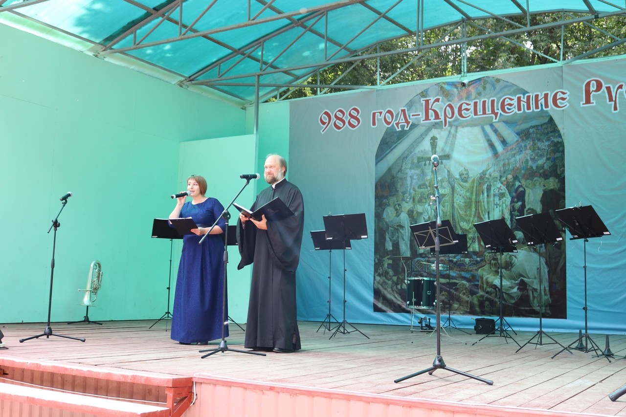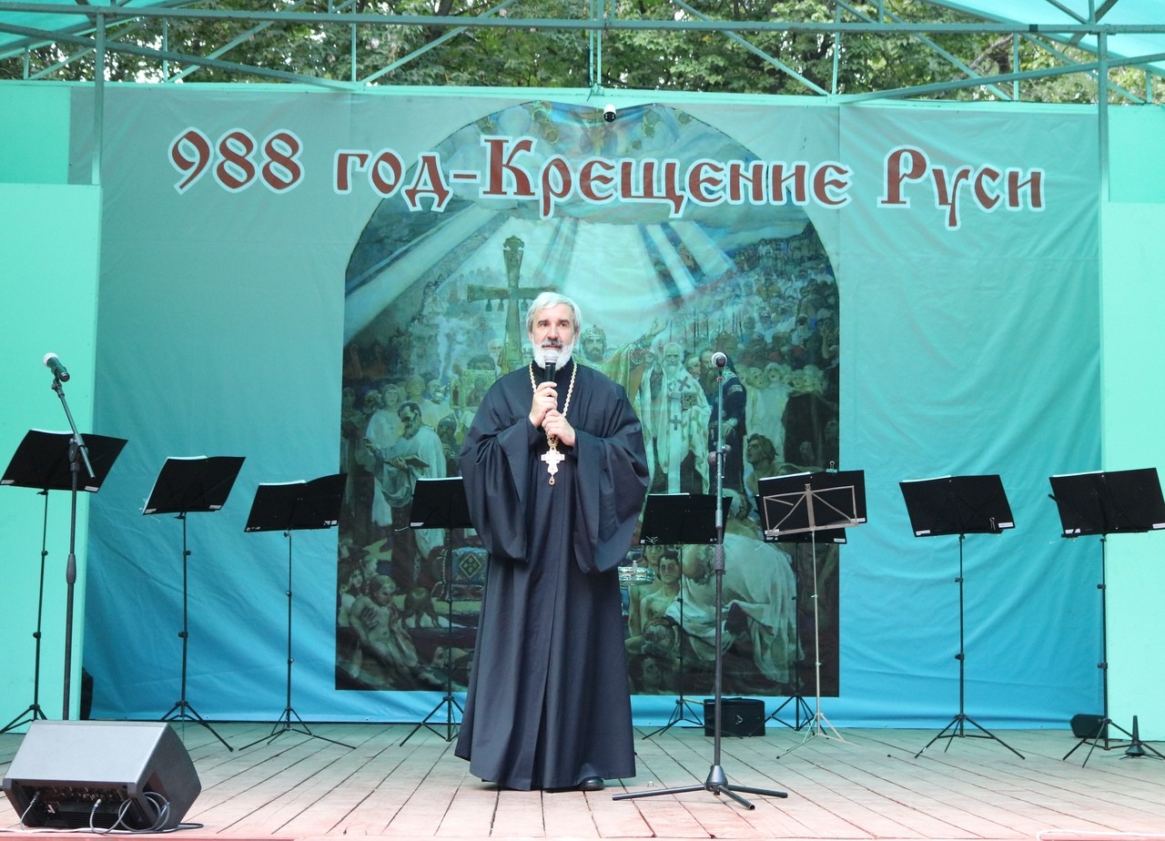 С приветственным словом обратился благочинный протоиерей Михаил Подолей: «Уважаемые Виталий Николаевич, Евгений Маерович, Виктор Иосифович! Дорогие братья и сестры! Сердечно поздравляю вас с празднованием 1030-летия Крещения Руси. Каждый народ, каждая страна, а иногда и отдельный город имеет своего просветителя. Мы с вами прославляем нашего просветителя – просветителя Руси святого равноапостольного великого князя Владимира. Мы благодарны Богу за то, что не только узнаем из новостей о таком значимом событии – праздновании Крещения Руси, но являемся его непосредственными участниками. И мы хотим для самих себя и для тех людей, которые пришли на праздник, чтобы в памяти и в сердце каждого осталось только светлое, доброе и чистое. Мы с вами знаем, что такое вера православная. Она совершает чудо, преображая природу человека, помраченную разными страстями и грехами. Будем всегда держаться пути, который выбрал для нас святой равноапостольной великий князь Владимир». Отец Михаил поблагодарил всех, кто потрудился ради устроения праздника.