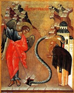 Небе́сных во́инств Архистрати́же,/ мо́лим тя при́сно мы, недосто́йнии,/ да твои́ми моли́твами огради́ши нас/ кро́вом крил невеще́ственныя твоея́ сла́вы,/ сохраня́я нас, припа́дающих приле́жно и вопию́щих:/ от бед изба́ви нас,// я́ко чинонача́льник вы́шних Сил.