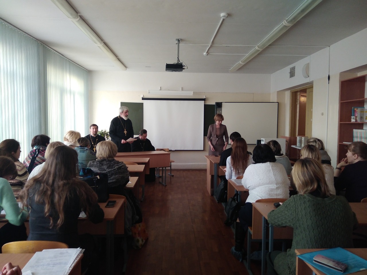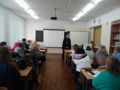 Благочинный поздравил всех слушателей с началом курсов повышения квалификации по Основам православной культуры в новом учебном году и представил преподавателей Санкт-Петербургской Духовной Академии, которые присутствовали в этот день на первой встрече и которые будут проводить занятия с января по май 2019 года, пожелав, чтобы «эти встречи с преподавателями Духовной Академии помогли разобраться в очень важных темах, заложенных в программу учебника, особенно связанных с историей Священного Писания и православным догматическим учением, и учителя смогли бы донести до детей христианские истины свободно, не боясь затрагивать самые сложные темы, например, Распятие Господа нашего Иисуса Христа». Также отец Михаил выразил пожелание, чтобы «время, проведенное на этих курсах, укрепило нас в мысли, что это очень важно, и чтобы каждый из нас занимался своим делом ответственно. Каждый, кто может внести свой вклад, свои умения, свои знания, свои силы в духовно-нравственное воспитание наших детей, должен это делать — это и есть та работа, которую мы с вами должны показывать».