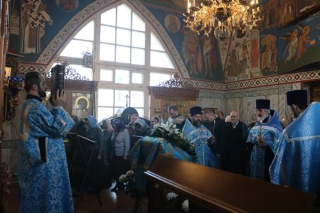 Днесь спасе́ния на́шего глави́зна,/ и е́же от ве́ка та́инства явле́ние:/ Сын Бо́жий, Сын Де́вы быва́ет,/ и Гаврии́л благода́ть благовеству́ет./ Те́мже и мы с ним Богоро́дице возопии́м:/ ра́дуйся, Благода́тная,// Госпо́дь с Тобо́ю.