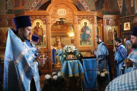 Арха́нгельский глас/ вопие́м Ти, Чи́стая:/ Ра́дуйся,/ Благода́тная,// Госпо́дь с Тобо́ю.