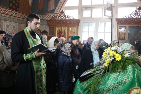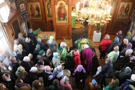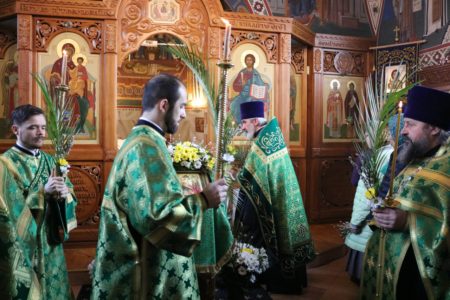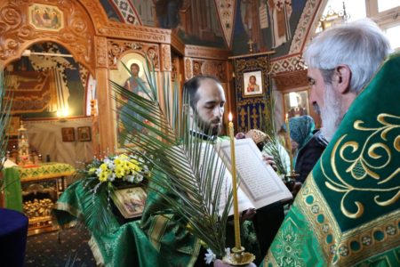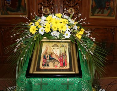 Бог Господь, и явися нам./ Составите праздник,/ и веселящеся приидите, возвеличим Христа,/ с ваиями и ветвьми, песньми зовуще:// благословен Грядый во имя Господа Спаса нашего.