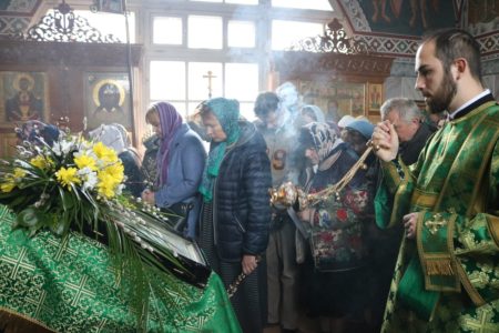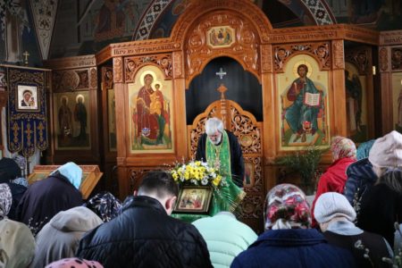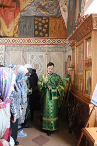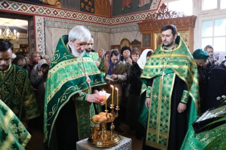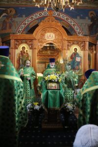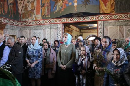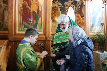 Спогре́бшеся Тебе́ креще́нием, Христе́ Бо́же наш,/ безсме́ртныя жи́зни сподо́бихомся Воскресе́нием Твои́м,/ и воспева́юще зове́м:/ оса́нна в вы́шних,// благослове́н Гряды́й во и́мя Госпо́дне.
