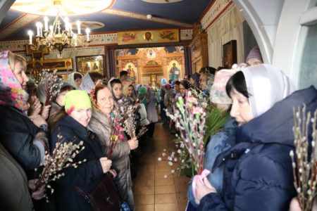 О́бщее воскресе́ние/ пре́жде Твоея́ стра́сти уверя́я,/ из ме́ртвых воздви́гл еси́ Ла́заря, Христе́ Бо́же./ Те́мже и мы, я́ко о́троцы побе́ды зна́мения нося́ще,/ Тебе́, Победи́телю сме́рти вопие́м:/ оса́нна в вы́шних,// благослове́н Гряды́й во и́мя Госпо́дне.