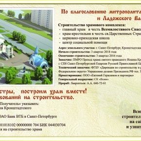 Мария Тихонова, корреспондент: «Храм в честь Всемилостивого Спаса появится на Кронштадтской площади позади действующего храма. Кстати, в этом году исполняется ровно 10 лет с момента его освещения. А этот закладной камень и крест появились здесь в июле, они обозначают центр будущего строения. Новую церковь планируют построить к лету 2016 года. Но собранных средств пока хватает только на начальный этап — закладку фундамента».