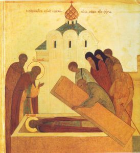 Днесь, я́ко со́лнце пресве́тло, возсия́вше от земли́,/ честны́я мо́щи твоя́ нетле́нны обрето́шася,/ я́ко благоуха́нный цвет, мно́жеством чуде́с сия́юще,/ и всем ве́рным источа́юще разли́чная исцеле́ния,/ и веселя́ще избра́нное твое́ ста́до,/ е́же му́дре собра́в, до́бре па́ствил еси́./ О ни́хже и ны́не Тро́ице предстои́ши, моля́ся,/ и во́инству победи́тельная на враги́ дарова́ти,/ да вси вопие́м ти:// ра́дуйся, Се́ргие богому́дре.