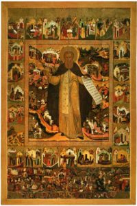 От ю́ности восприя́л еси́ Христа́ в души́ твое́й, преподо́бне,/ и па́че всего́ вожделе́л еси́ мирска́го мяте́жа уклони́тися:/ му́жески в пусты́ню всели́лся еси́/ и ча́да послуша́ния в ней, плоды́ смире́ния, возрасти́л еси́./ Те́м, быв Тро́ице вселе́ние,/ чудесы́ твои́ми всех просвети́л еси́, приходя́щих к тебе́ ве́рою,/ и исцеле́ния всем подая́ оби́льно.// О́тче наш Се́ргие, моли́ Христа́ Бо́га, да спасе́т ду́ши на́ша.