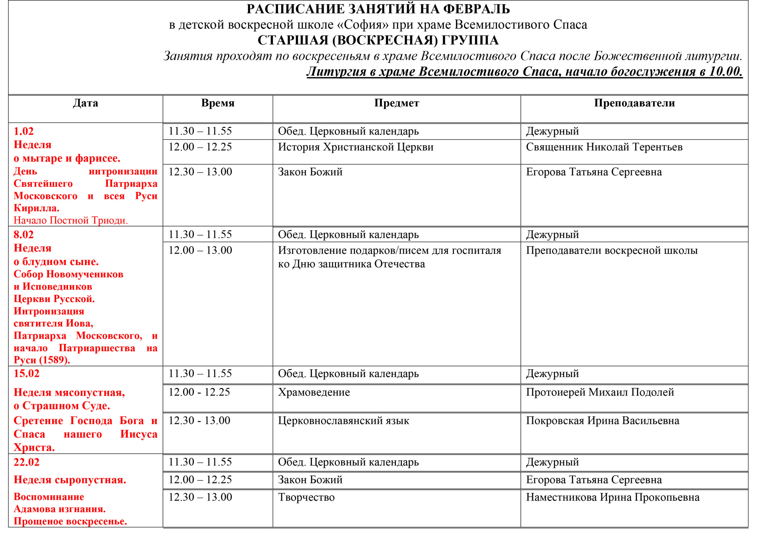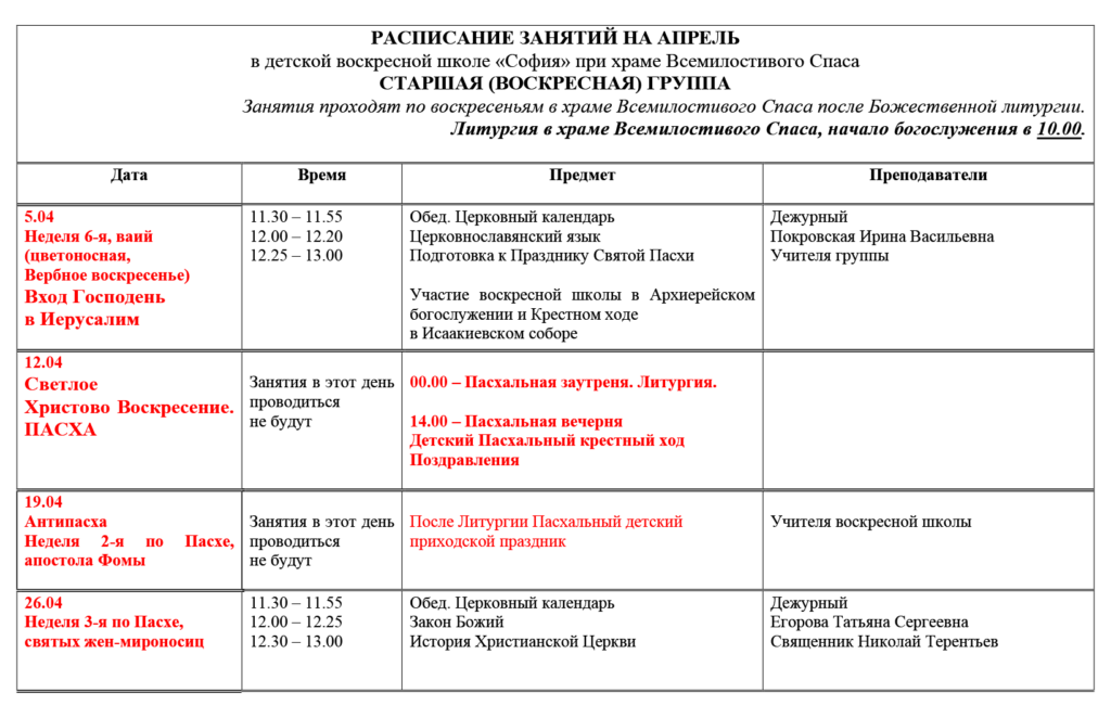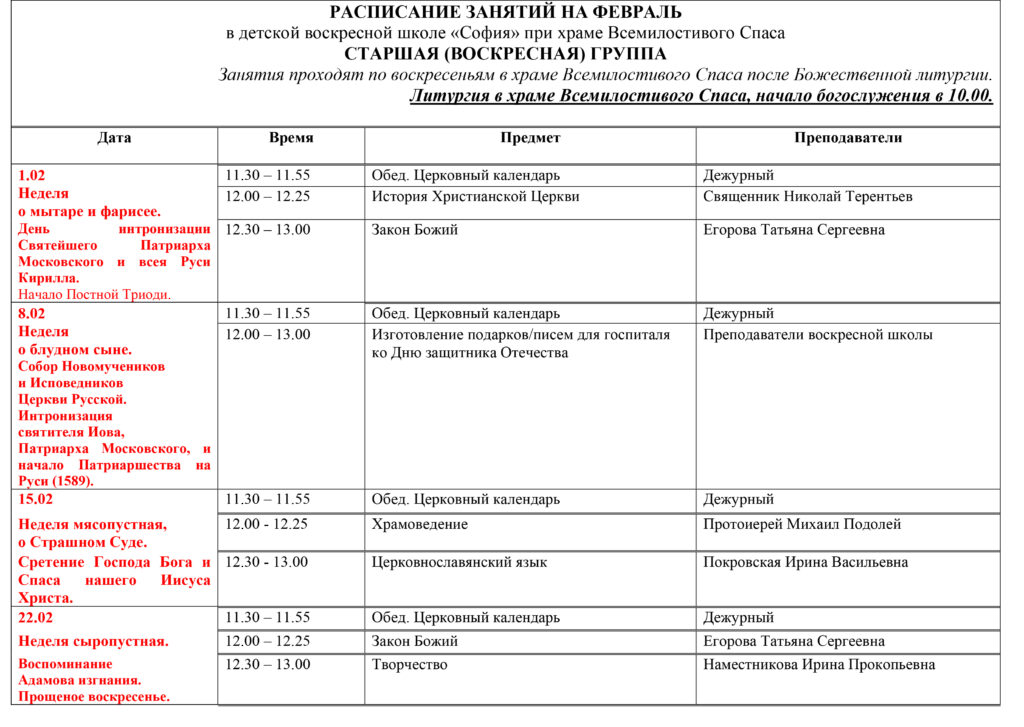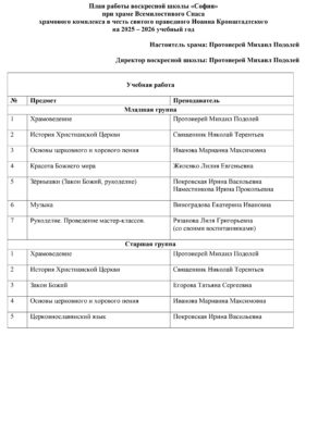 В воскресной школе изучаем следующие предметы: