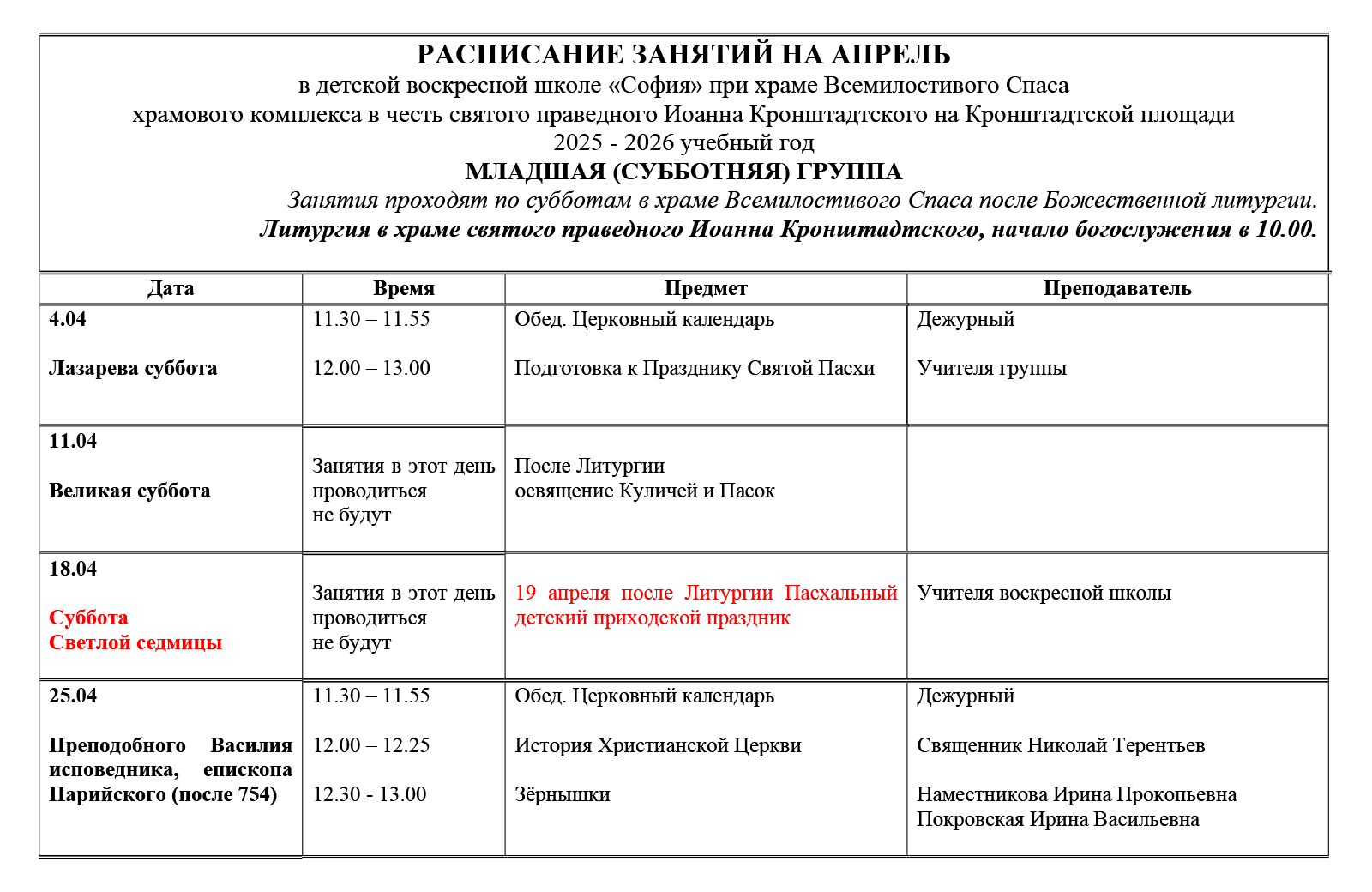 Детская воскресная школа при храме святого праведного Иоанна Кронштадтского на Кронштадтской площади «СОФИЯ» приглашает на обучение детей возрастом от 5 до 15 лет. Запись в воскресную школу происходит через подачу личного прошения. Бланк прошения можно взять в свечной лавке храма.